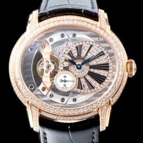 - 메인 다이아몬드 셋팅 & 골드 다이얼,블랙 로마 인덱스 - 9시방향 헤어스프링 스켈레톤 다이얼 - 다이아몬드 셋팅 화이트 자게 세컨드 서브 다이얼 - 1:1수공맞물림 형식으로 셋팅완료 |