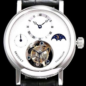 - 고급스러운 물결무늬 유백색의 투어빌론 다이얼 - 12시방향 실버다이얼 디스플레이 - 3시방향 문페이즈 - 6시방향 리얼 뚜르비용 케이지 작동 |