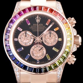 - 블랙다이얼,무지개 컬러 바게트 컷 다이아몬드 세팅 - 1:1수공정 바게뜨 컷 레인보우 다이아몬드 쥬얼 셋팅 - 크로노그래프(Chronograph) 시간계 , 30분계 , 영구초침(Small Seconds) - 3시 방향에 30분단위 스탑워치서브 다이얼과 6시방향의 영구초침 서브다이얼 - 9시방향의 12시간 단위 스탑원치 크로노 그래프 기능이 장착 |