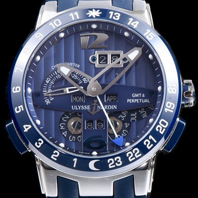 - 블루 다이얼,6,12시 빅사이즈의 아라비안 인덱스 - 날짜,요일, 월, 영구초침 서브다이얼 디스플레이 - 디테일한 스트라잎 타입 기요쉐 다이얼 - 두가지 시간대를 표시해주는 GMT 기능 |