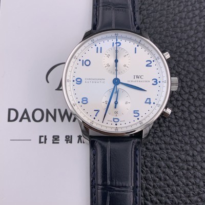 - 2017년 신상품 출시 - 깔끔한 느낌의 베스트 모델의 귀환 포르투기즈 크로노그래프 라인 - 크지도 작지도 않은 적당한 싸이즈 - 정장과 캐쥬얼 어느곳에도 두루 잘 어울리는 에브리데이 워치 - 피부 트러블이 없는 316L 스테인레스 스틸 브레이슬릿 소재 - GEN과 동일한 동작이 가능한 크로노그래프 기능 - 최종적 수정처리 완료 내구성과 안정성 검증된 수정형7750 무브먼트 사용 - IWC 정교한 브랜드 로고가 각인된 신형 용두로 변경 - 이태리 수입산 최고급 가죽밴드 - 탱버클-> 고급 디버클 타입(Deployant-Clasp) 으로 변경 - 크로노그래프(Chronograph) 30분계, 영구초침(Small Seconds) - 최신버전 업그레이드형 |