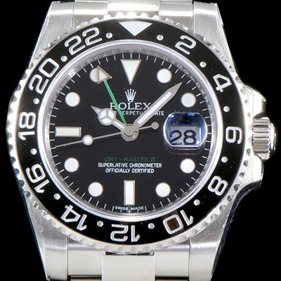 GMT-마스터II GMT-MasterII는 12시간을 기준으로 하는 일반적인 시,분,초 외에도 24시간용 시침 및 24시간이 음각으로 표시된 양방향 회전 베젤을 장착하고 있습니다.눈에 띄는 컬러로 표시된 24시간용 시침이 가리키는 베젤의 눈금을 통해 제 1시간대의"본국 시각"을 확인할 수 있습니다.여행지 현지 시각은 와인딩 크라운의 독창적인 메커니즘을 통해 매우 간편하게 조정됩니다.시침은 분침과 초침에 영향을 주지 않고 독립적으로 움직이기 때문에 정밀한 타임키핑에 영향을 미치지 않고 새로운 시간대를 적용할 수 있습니다. |