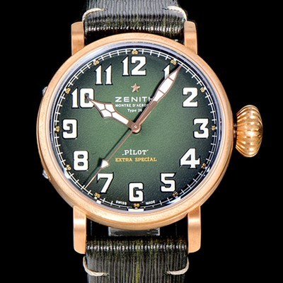 미러급 제니스 남성용 파일럿 타입 20 애드벤쳐 브론져제질 오토매틱 9015무브 45미리 가죽시계 그린다이얼 ZEN77591 Ⅳ