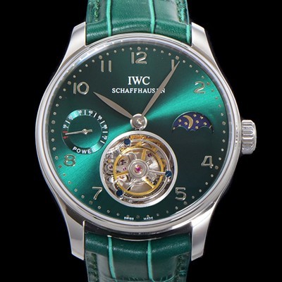 미러급 아이더블유씨 남성용 신제품 UP!! 포르투기즈 컴플리케이션 하이  "투어빌론 문페이즈 파워 리저브"아시안 투어빌론 탑재  42mm 가죽줄 그린 다이얼   iwc9359 Ⅳ