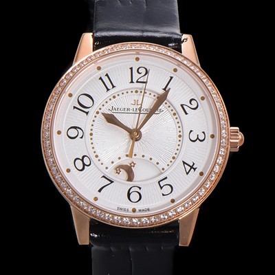 미러급 예거 르꿀르뜨 여성용 랑데뷰 나잇&데이 문페이즈 오토매틱 898A 타입 무브 34mm 금장시계 보석  배젤 가죽줄 화이트다이얼 jag9251 Ⅳ